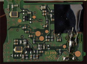 This one turned out to be a little more difficult to modify. First of all, figuring out how to get the thing open was the first hurdle. There are no screws on it. Instead the two halves are held together with a plastic band with notches on it. I believe I used a screwdriver to gently pry it off. Secondly, the radio board is very small, measuring only 25x35 mm.